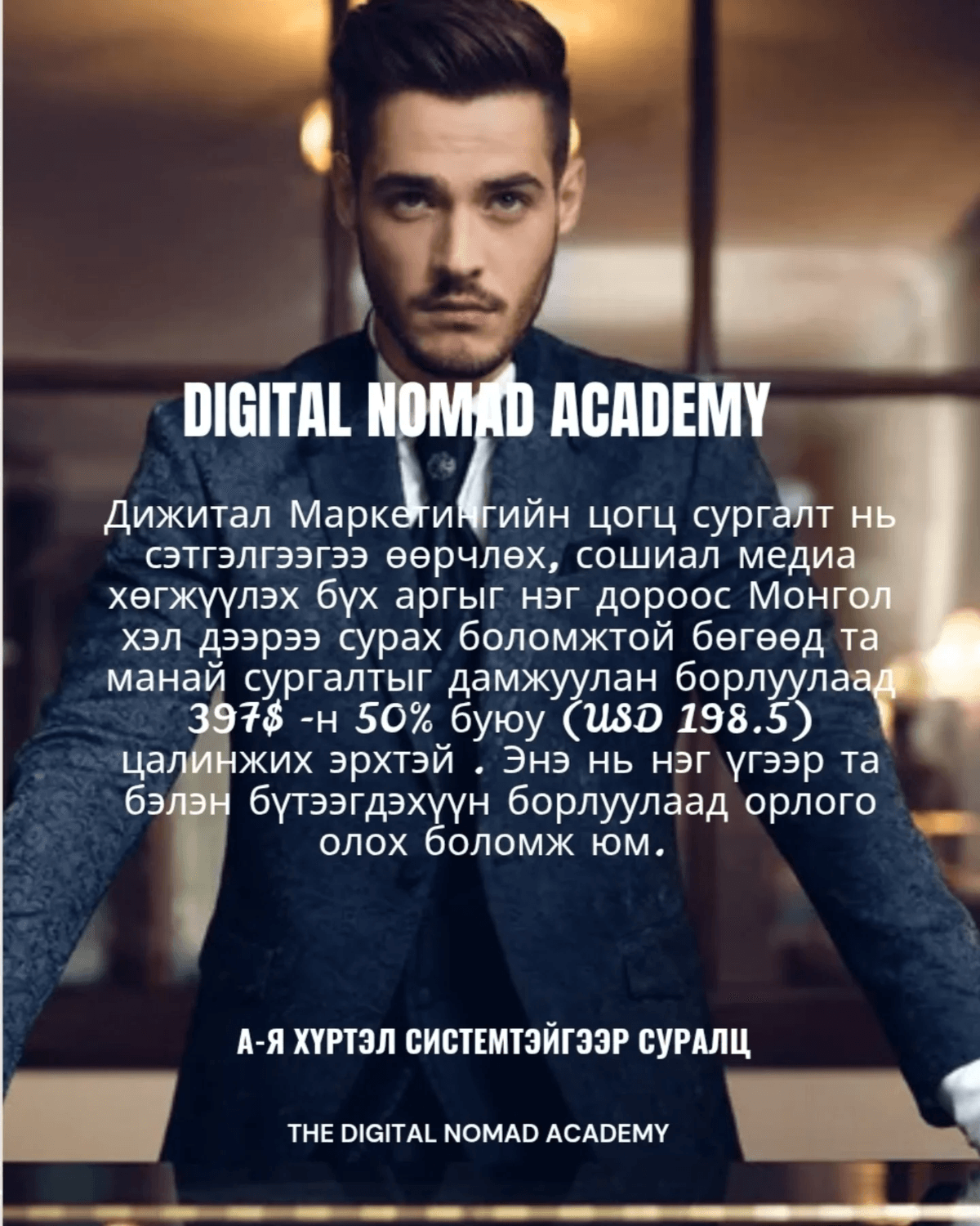 Дижитал Маркетингийн цогц сургалт нь онлайнаар орлого олох, сэтгэлгээгээ өөрчлөх, сошиал медиа хөгжүүлэх бүх аргыг нэг дороос Монгол хэл дээрээ сурах боломжтой бөгөөд та манай сургалтыг дамжуулан борлуулаад 397$ -н 50% буюу (USD 198.5) цалинжих эрхтэй . Энэ нь нэг үгээр та бэлэн бүтээгдэхүүн борлуулаад орлого олох боломж юм.